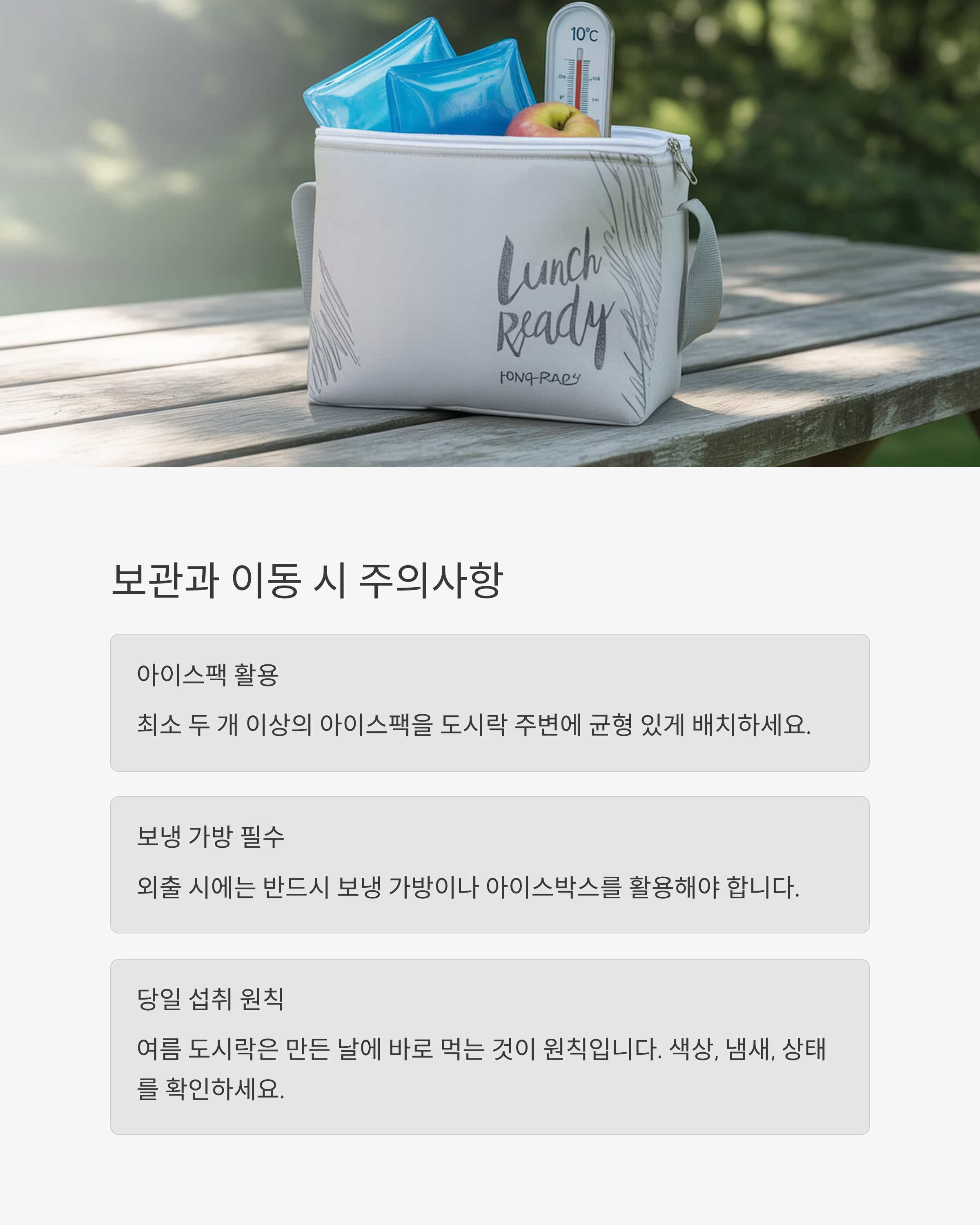 도시락을 싸는 것보다 더 중요한 것은 그 상태를 얼마나 잘 유지하느냐입니다. 아이스팩은 적어도 두 개 이상 사용하고 도시락 주변에 균형 있게 배치하세요. 외출 시에는 반드시 보냉 가방이나 아이스박스를 활용해야 합니다. 이동 시간이 길다면 냉장고에 미리 보관해 두는 것도 좋은 방법입니다.